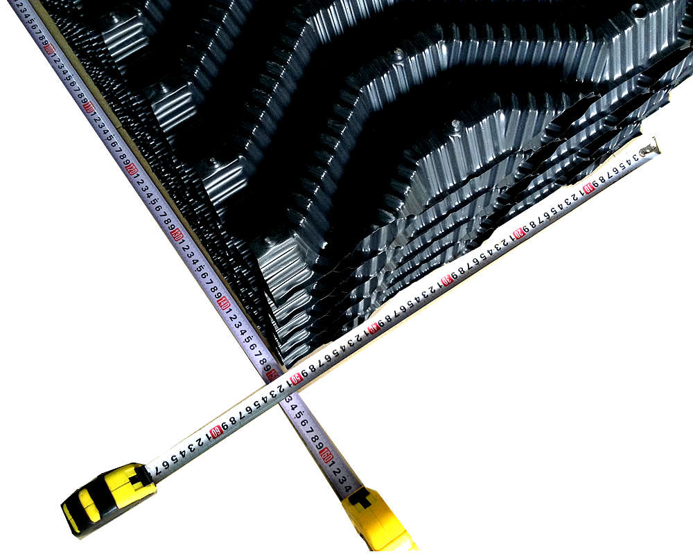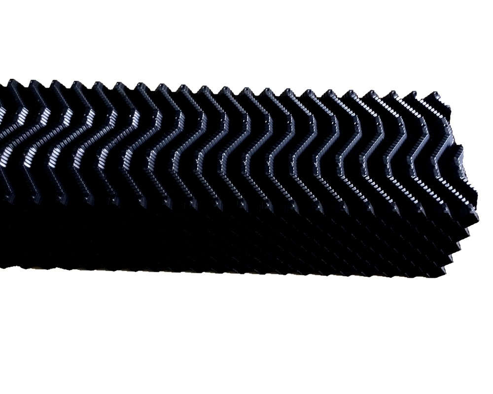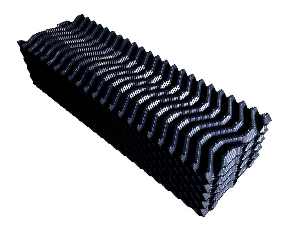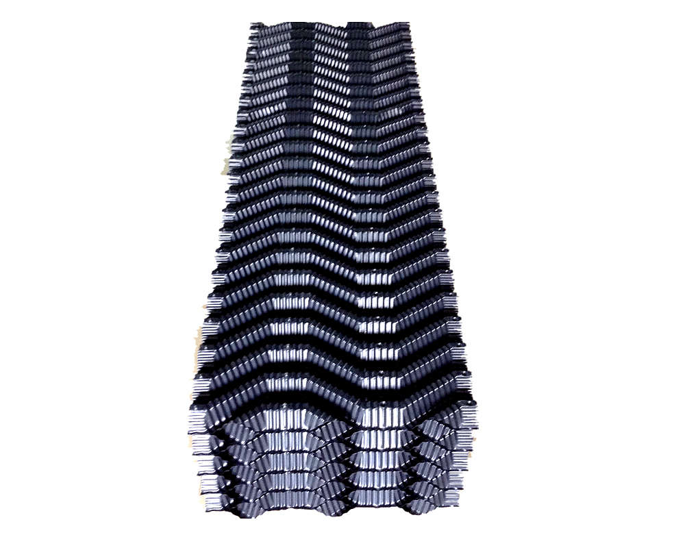 冷卻塔塔芯填料是由優(yōu)質(zhì)PVC聚乙烯片正負(fù)壓及吸塑而成,主要采用了水紋波形、梯形波、點(diǎn)波形、S波型、人字波形填料,散熱面積增長系數(shù)大,水流在板面上分布性能好,水和空氣流經(jīng)板面時(shí)擾動(dòng)大等優(yōu)點(diǎn)。填料不易變形,耐高溫,抗老化,且阻燃性能好,風(fēng)阻系數(shù)小。安裝方便,易清洗,運(yùn)輸方便該散熱填料采用粘接式及懸掛式,安裝簡便,便于清洗,且成功解決了粘接填料因吸積垢、自重而產(chǎn)生變形,且變形后積垢更加嚴(yán)重、難于清洗的問題。填料阻燃性能好,阻燃氧指數(shù)指標(biāo)為42.7,每立方米組裝體質(zhì)量約為15 kg—30kg/m3,組裝高度為0.5m—3.0m,交錯(cuò)布置,對于塔壁周邊異形塊可視現(xiàn)場布置情況,按實(shí)際尺寸切割、安裝。