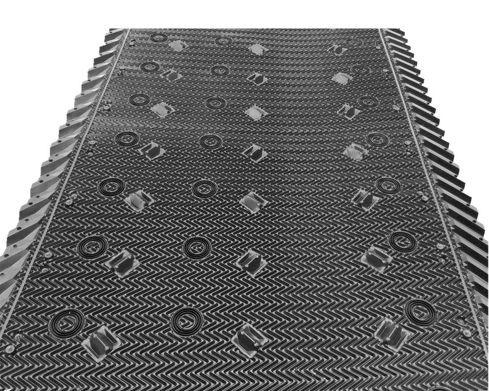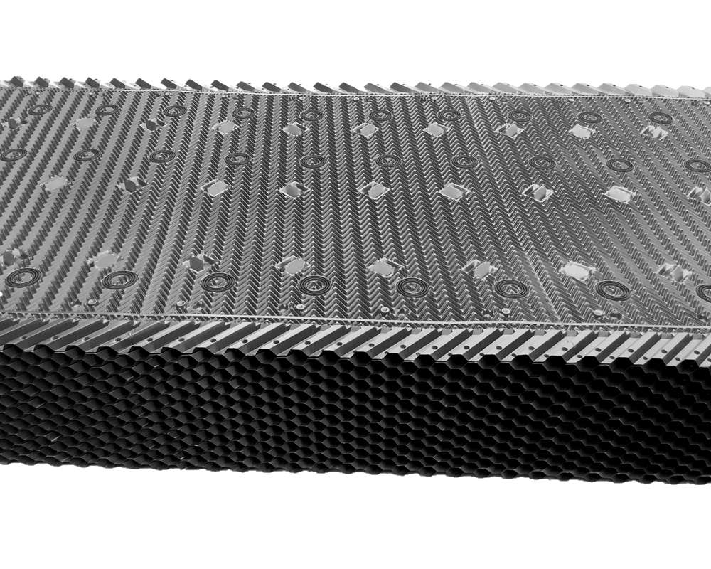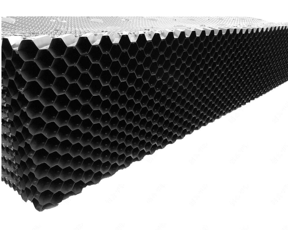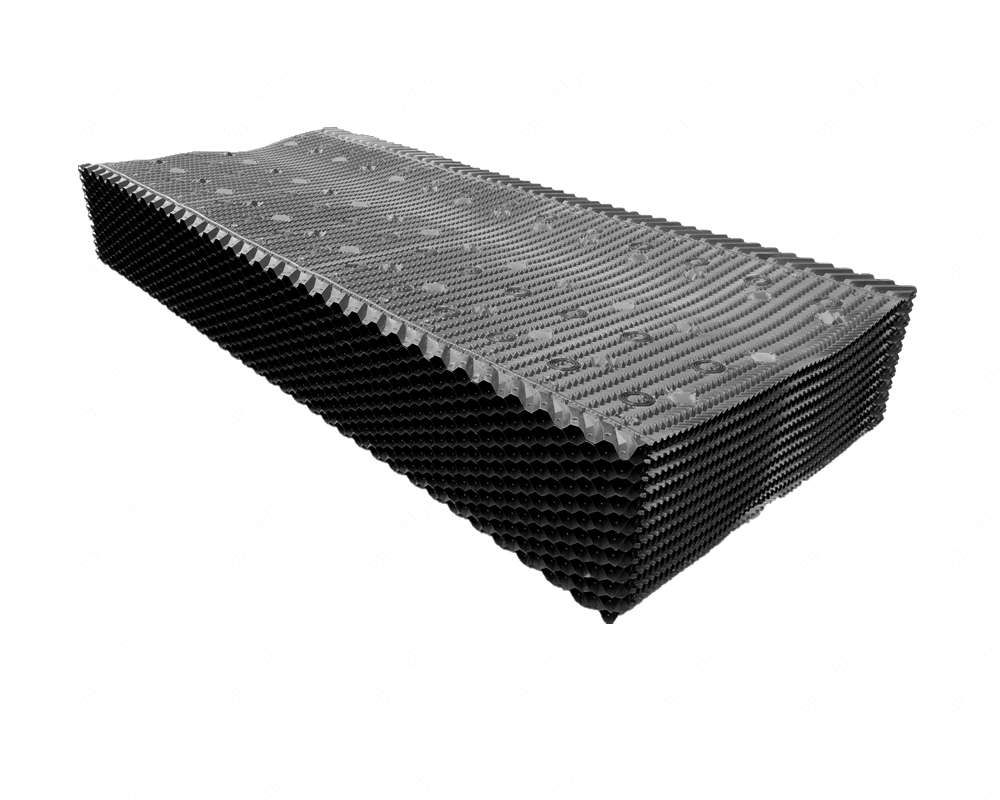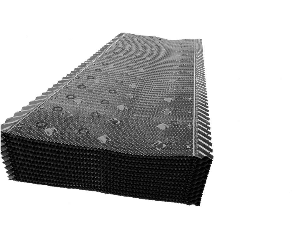 冷卻塔塔芯填料是由優(yōu)質(zhì)PVC聚乙烯片正負(fù)壓及吸塑而成,主要采用了水紋波形、梯形波、點(diǎn)波形、S波型、人字波形填料,散熱面積增長系數(shù)大,水流在板面上分布性能好,水和空氣流經(jīng)板面時(shí)擾動(dòng)大等優(yōu)點(diǎn)。填料不易變形,耐高溫,抗老化,且阻燃性能好,風(fēng)阻系數(shù)小。安裝方便,易清洗,運(yùn)輸方便該散熱填料采用粘接式及懸掛式,安裝簡便,便于清洗,且成功解決了粘接填料因吸積垢、自重而產(chǎn)生變形,且變形后積垢更加嚴(yán)重、難于清洗的問題。填料阻燃性能好,阻燃氧指數(shù)指標(biāo)為42.7,每立方米組裝體質(zhì)量約為15 kg—30kg/m3,組裝高度為0.5m—3.0m,交錯(cuò)布置,對于塔壁周邊異形塊可視現(xiàn)場布置情況,按實(shí)際尺寸切割、安裝。