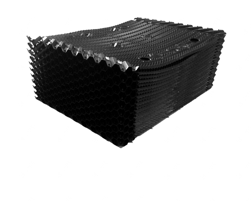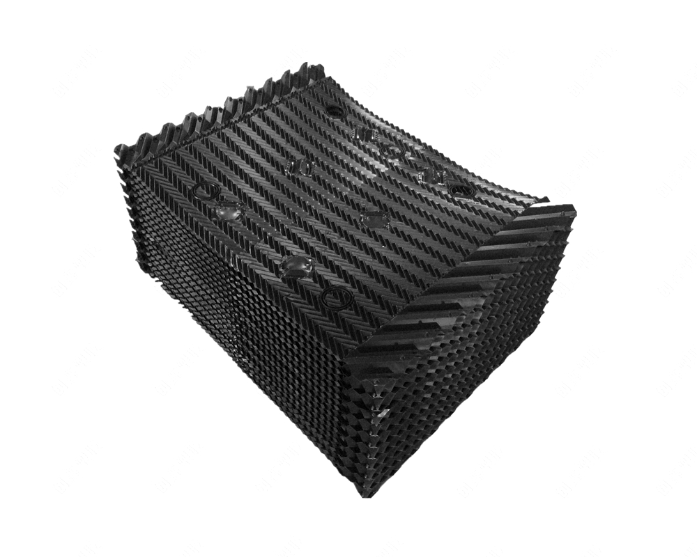 冷卻塔塔芯填料是由優(yōu)質(zhì)PVC聚乙烯片正負(fù)壓及吸塑而成,主要采用了水紋波形、梯形波、點(diǎn)波形、S波型、人字波形填料,散熱面積增長系數(shù)大,水流在板面上分布性能好,水和空氣流經(jīng)板面時(shí)擾動(dòng)大等優(yōu)點(diǎn)。填料不易變形,耐高溫,抗老化,且阻燃性能好,風(fēng)阻系數(shù)小。安裝方便,易清洗,運(yùn)輸方便該散熱填料采用粘接式及懸掛式,安裝簡便,便于清洗,且成功解決了粘接填料因吸積垢、自重而產(chǎn)生變形,且變形后積垢更加嚴(yán)重、難于清洗的問題。填料阻燃性能好,阻燃氧指數(shù)指標(biāo)為42.7,每立方米組裝體質(zhì)量約為15 kg—30kg/m3,組裝高度為0.5m—3.0m,交錯(cuò)布置,對(duì)于塔壁周邊異形塊可視現(xiàn)場(chǎng)布置情況,按實(shí)際尺寸切割、安裝。